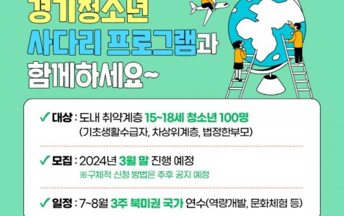경기도가 청년들에게 해외연수 기회를 제공하는 사다리 프로그램 참가 대상을 기존 청년에서 저소득층 취약계층 청소년까지 확대한다. 저소득 취약계층 청소년에게도 해외연수와 문화체험 등 해외에서의 진로 탐색 기회를 제공해 자기개발을