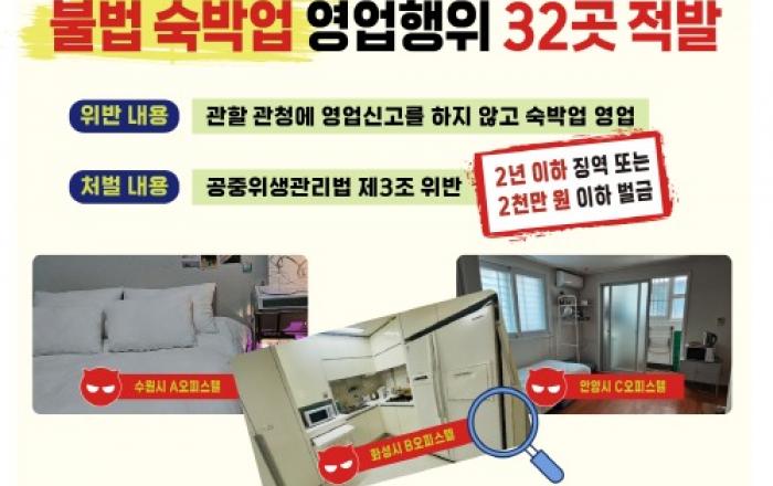 숙박업 신고 없이 오피스텔, 주택, 아파트 등에서 영업을 한 불법 숙박업체 32곳이 경기도 특별사법경찰단 수사에 적발됐다. 경기도 특별사법경찰단은 5월 13일부터 31일까지 수원, 부천, 성남, 고양 등 12개 지역에서 불법