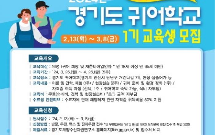 경기도해양수산자원연구소가 귀어귀촌 활성화를 위한 2024년 경기도 귀어학교 1기 교육생을 13일부터 다음 달 8일까지 모집한다. 경기도 귀어학교는 귀어를 희망하거나 어촌에 살지만 어업에 종사하지 않는 주민 등을 대상으로 어촌