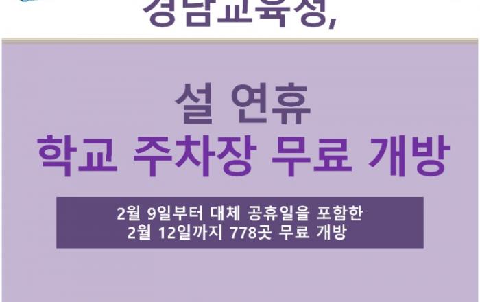 경상남도교육청은 설 연휴 기간(2월 9일~12일, 4일간) 도민과 귀성객의 주차 편의를 제공하고자 공사 등으로 참여가 어려운 일부 학교·기관을 제외한 도내 교육행정기관과 공사립 학교 778곳 주차장을 무료로 개방한다.설 연휴 학교 주차장을 이용하려는 사람은 미리 경남교
