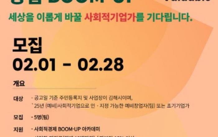 김해시는 ‘2024년 사회적기업 창업 BOOM-UP(붐업)’에 참여할 예비, 초기 창업자를 모집한다고 2일 밝혔다.이 사업은 사회문제 해결, 지역사회 공헌 등 사회적 가치를 실현할 수 있는 예비 및 초기 창업자를 대상으로 창업부터 단계별로 밀착 지원하는 사업이다.시는