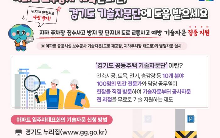 경기도가 기술전문가들로 구성된 ‘경기도 공동주택 기술자문단’을 운영하고 있다며 지하 주차장 침수 방지시설 같은 아파트 보수 공사시 자문 신청을 해달라고 당부했다. ‘경기도 공동주택 기술자문단’은 건축시공, 토목, 전기, 승강기 등 10개 분야