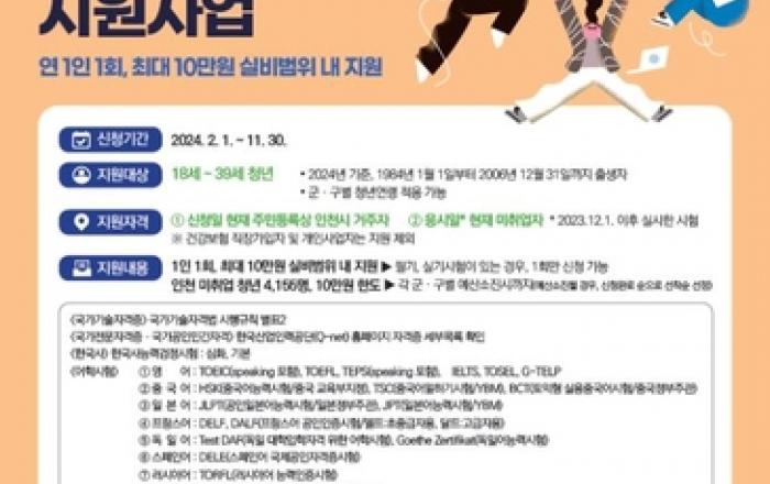 인천광역시는 취업에 어려움을 겪고 있는 인천 청년의 경제적 부담을 덜어 주기 위해 미취업 청년을 대상으로 자격증·어학시험 등 시험 응시료를 1인당 연 1회, 최대 10만 원까지 지원한다고 밝혔다. 지원 규모는 인천시 미취업 청년 4,155명이며, 신청 기간은 2월