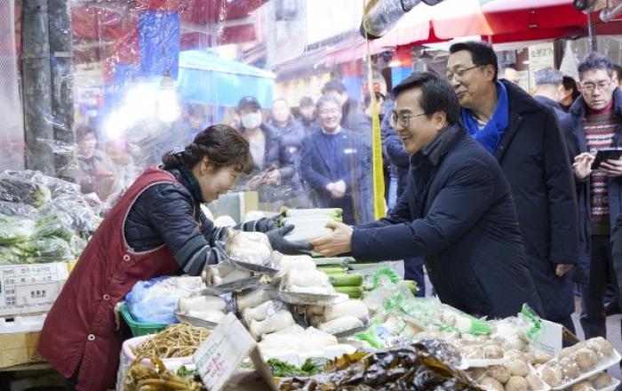 김동연 경기도지사가 설을 앞두고 도내 전통시장을 잇따라 방문하며 민생현장을 살펴보고 상인들을 격려했다. 김동연 지사는 31일 성남시 중원구 은행시장과 남한산성시장을 찾아 농산물, 육류, 가공식품 등을 구매한 뒤 상인들과 간담회를 가졌다. 이 자