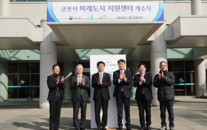 군포시는 지난 30일 5개 신도시 중 최초로 '미래도시지원센터' 개소식을 열었다. 개소식에는 하은호 군포시장과 박상우 국토교통부장관, 이한준 LH 사장, 김용석 산본 총괄기획가, 국토부 도시정비준비단장, 산본 주민대표 등 100여 명이 참석했다. 현판식을 마치