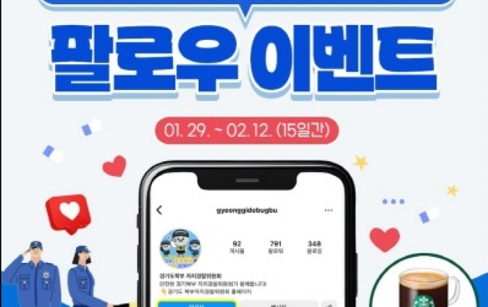 경기도북부자치경찰위원회는 도민들과 소통과 교감을 강화하기 위해 공식 누리소통망(SNS)인 인스타그램 팔로우 이벤트를 실시한다. 이벤트는 1월 29일부터 2월 12일까지 2주간 경기도북부자치경찰위원회 인스타그램(@gyeonggidobugbu)
