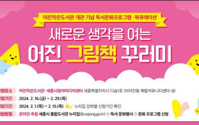 세종시립도서관이 내달 1일부터 ‘2024년 어진작은도서관 개관 기념 독서문화 프로그램’에 참여할 수강생을 모집한다. 이번 프로그램은 볼로냐 라가치상을 2회 수상한 정진호 작가의 초청 강연, 세종시청자미디어센터 연계 강좌 등 6개 강좌로 운영된다. ‘