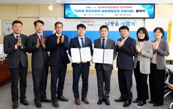 인천시 남동구는 최근 중소벤처기업진흥공단(중진공)과 '남동형 청년근로자 내일채움공제 지원사업' 추진을 위한 업무협약을 맺었다고 26일 밝혔다. 이 사업은 5년간 장기 재직하는 청년 핵심 인력에 인센티브를 지원하는 중진공의 '내일채움공제'의 기업부담금 일부(7만 원)