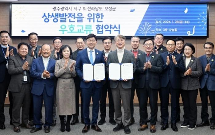 광주광역시 서구와 전남 보성군이 26일 상생 발전을 위한 우호교류 협약을 체결했다. 김이강 서구청장과 김철우 보성군수는 이날 서구청에서 교류협약을 체결하고 향후 주민 삶의 질 향상과 지역의 공동 발전을 위해 협력하기로 약속했다. 협약의 주요 내용은 ▲문화·예술, 행