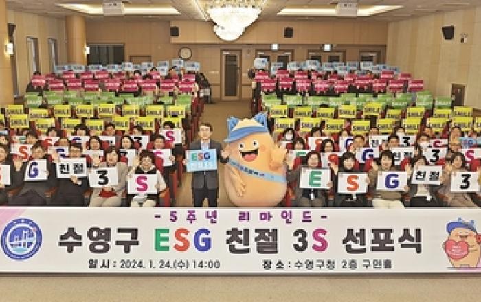 부산광역시 수영구는 지난 24일 '친절 3S 운동' 5주년을 맞이해, '5주년 리마인드「ESG 친절 3S」 선포식'을 가졌다고 밝혔다. '친절 3S 운동'은 고객만족도의 획기적인 향상을 도모하고 구민에게 감동을 주는 친절 행정을 달성하기 위해 수영구에서 2019년