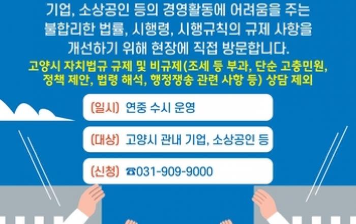 고양특례시는 적극행정의 일환으로 발로 뛰는 규제 발굴을 위해 직접 현장에 방문해 기업애로 사항 등을 청취하는 '찾아가는 지방규제신고센터'를 확대 운영한다고 23일 밝혔다. '찾아가는 지방규제신고센터'는 기업, 소상공인 등에 불필요한 부담을 주는 규제, 창업과 투자