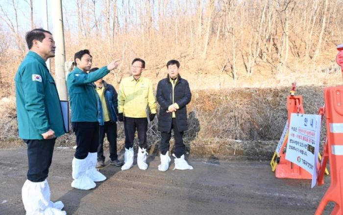 파주시 양돈농가에서 올해 경기도 내 첫 아프리카돼지열병이 발생한 가운데 오후석 경기도 행정2부지사가 19일 발생 농가 통제초소를 방문해 방역 현장을 긴급 점검했다. 오 부지사는 방역 관리 상황을 살핀 후 현장 방역직원들을 격려하며 빈틈없는 철저