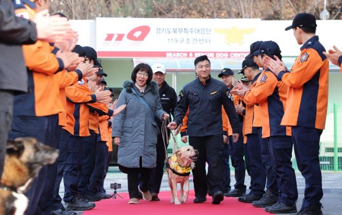 경기도북부특수대응단은 19일 국민의 생명지킴이로 활약했던 인명구조견 ‘아롱’의 영예로운 은퇴식을 진행했다. 경기도북부특수대응단 119구조견센터에서 열린 이날 행사는 문태웅 경기도북부특수대응단장과 박애경 한국애견협회 부회장 등이 참여한 가운데 구