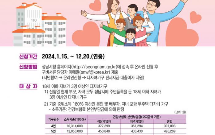 성남시는 다자녀가구에 전세자금 대출이자를 최대 100 만원 지원하는 사업을 펴기로 하고 , 오는 12 월
