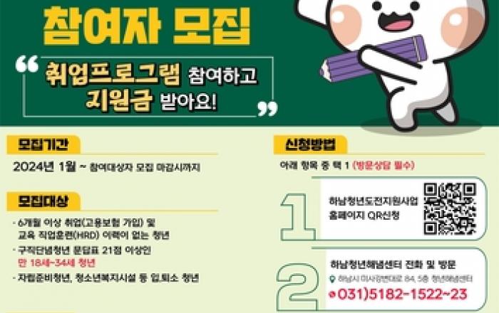 하남시가 취업에 어려움을 겪고 있는 청년들을 지원하는 '2024년 청년도전 지원사업'을 추진한다. 시는 이를 위해 '도전 프로그램'과 '도전+ 프로그램'을 개설하고, 최대 300만원까지 참여 수당을 지급할 계획이다. '도전 프로그램'은 5주 과정으로 20명을 모