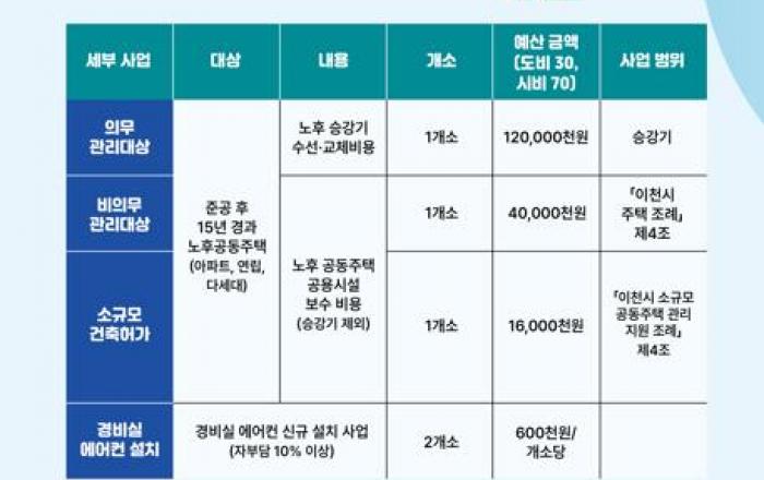 이천시는 '2024년 공동주택 지원사업'과 함께 '2024년 노후 승강기 등 공동주택 주거환경개선 지원사업'을 2024년 1월 31일까지 지방보조금관리시스템을 통해 신청 받는다. 이 사업은 준공 후 15년이 지난 공동주택을 대상으로 의무관리대상 공동주택 승강기 교