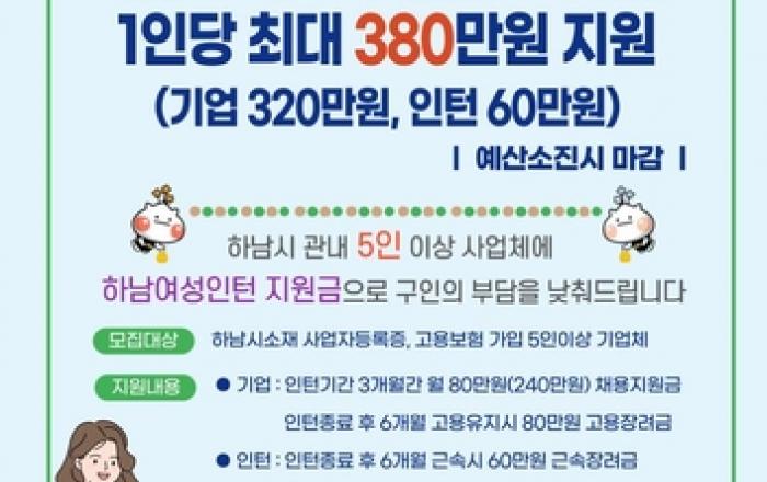 하남시가 미취업 여성의 일자리 경험 제공과 기업의 고용지원을 위해 '하남여성인턴 사업'을 실시한다. 11일 시에 따르면 이번 사업은 하남시가 현주소인 구직자·미취업 여성과 상시 근로자 5인 이상의 지역 내 기업을 지원하며, 일자리 안착과 장기 고용 유지를 위해 인턴