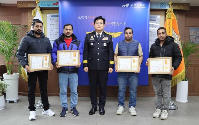 경기도북부소방재난본부 포천소방서는 11일 오후 서장 집무실에서 차량화재 현장에서 생명을 구한 방글라데시 국적의 사카르 고팔(35)씨 등 4명에게 소방서장 표창을 수여했다. 소방서에 따르면 사카르 고팔씨 등 4명은 지난달 30일 17시 26분경