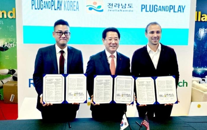 김영록 전라남도지사는 10일(현지 시간) 미국 라스베이거스에서 열린 '소비자 전자제품 전시회(CES)'에서 세계 최대 스타트업 액셀러레이터 기업인 플러그앤플레이(PNP)와 전남 기업 혁신성장을 위한 업무협약을 했다. 액셀러레이터는 스타트업을 발굴해 지원하는 기업이다