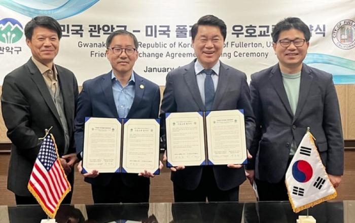 관악구가 1월 10일(현지 시각) 미국 풀러턴시와 우호 교류 협약을 체결했다. 구와 풀러턴시는 지난해 7월 관악구 대표단의 풀러턴시 방문을 시작으로 연을 맺었다. 이후 원활한 교류협력 사업 추진을 위해 풀러턴시 대표단도 구에 방문하는 등 수차례의 실무 협의를 거쳐
