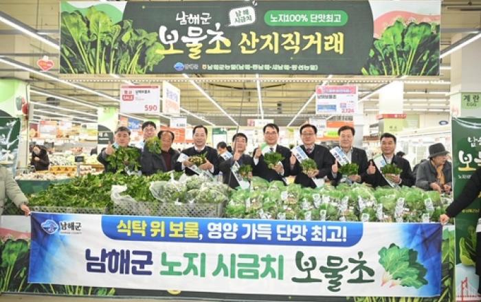 남해군은 10일부터 22일까지 서울 하나로마트 양재점과 창동점에서 수도권 소비자를 공략하기 위한 시금치 '보물초' 특판 행사를 펼친다. 특판행사 가격은 보물초 100g에 590원이며, 300g 묶음 한 단은 2,780원이다. 10일 하나로마트 양재점에서 열린