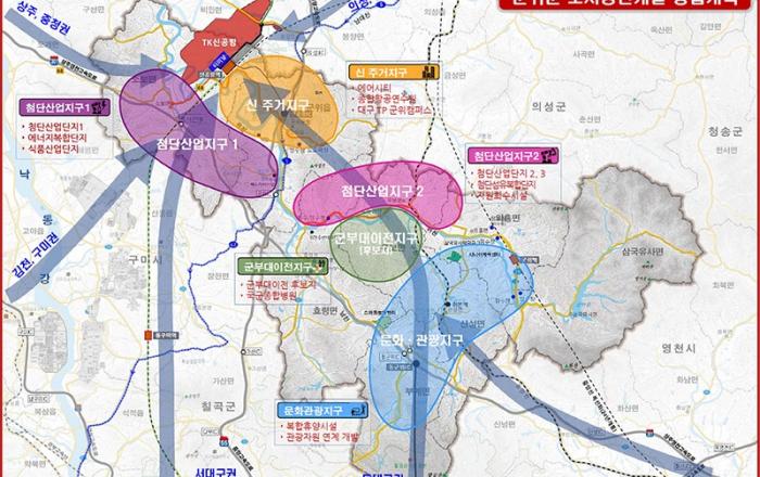 대구광역시는 대구경북신공항 개항에 대비하고 군위군을 TK 미래 100년을 이끌 ‘글로벌 신공항 관문’으로 발전시키기 위한 ‘군위군 도시공간개발 종합계획’을 수립했다. 〈군위군 도시공간개발 종합계획도〉 대구광역시는 군위군에 TK신공항과 연계한 첨단산업단지, 배후