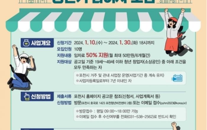 포천시는 오는 10일부터 30일까지 창업 초기 청년들의 안정적인 정착을 위해 '청년 창업자 임차료 지원사업' 상반기 참여자 10명을 모집한다. '청년 창업자 임차료 지원사업'은 창업 자본이 부족한 청년 창업자들에게 임차료의 일부를 보조해 안정적인 정착을 할 수 있도