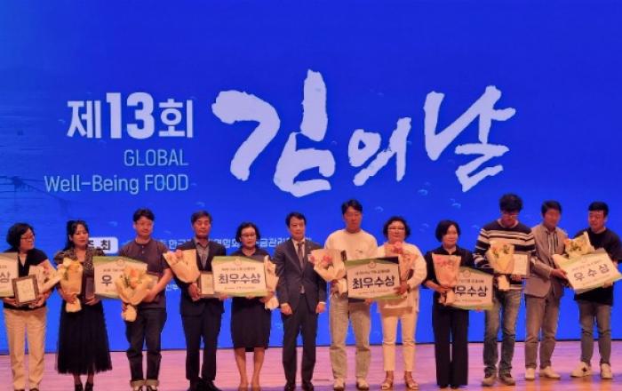전라남도는 13일 완도 문화예술의전당에서 개최된 ‘김의 날’ 행사에서 전남 으뜸 마른 김 톱10을 시상했다.마른 김 톱10은 지난 4월 2024년산 마른김을 대상으로 개최한 제3회 전남 으뜸김 품평회를 통해 선발됐다. 으뜸김 품평회는 전남 김의 우수성을 평가·홍보하고,