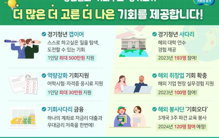 ‘기회수도’ 경기도가 청년층에게 더 많은, 더 고른, 더 나은 기회를 제공하기 위해 다양한 정책을 추진하고 있다. 단순히 청년에게 금전적 지원을 하는 것을 넘어 새로운 도전을 할 수 있는 기회, 하고 싶었던 일을 해볼 수 있는 기회, 희망을 가질 수 있