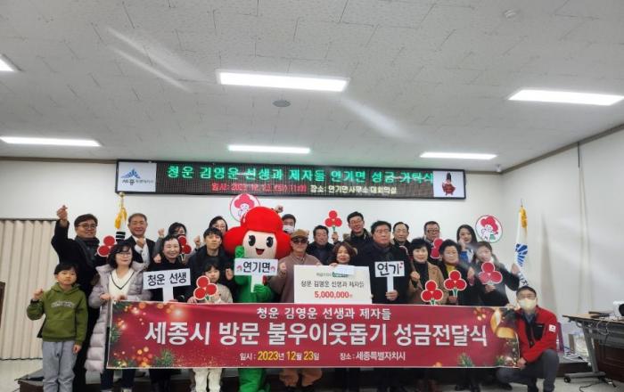 세종특별자치시 연기면에 연기면 출신 풍수지리연구가 청운 김영운 선생과 제자들이 직접 모은 이웃사랑 성금이 전달됐다. 청운 김영운 선생은 제자들과 함께 지난 23일 이웃사랑 성금 500만 원을 연기면 지역사회보장협의체에 지정 기탁했다. 청운 선생은 “
