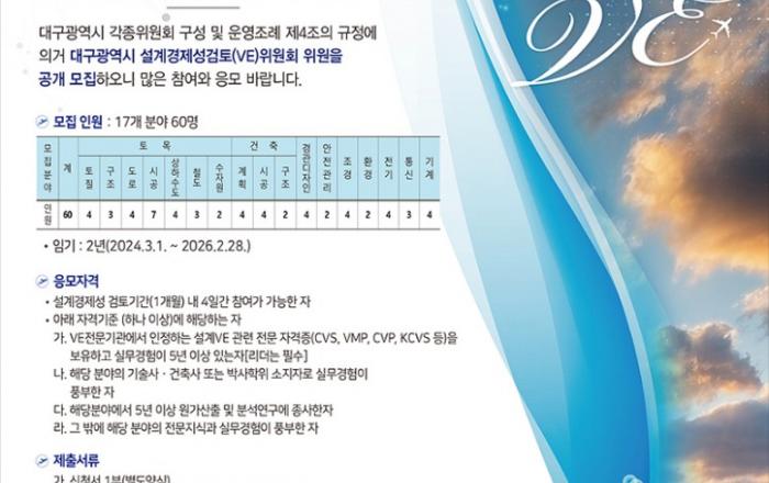 대구광역시는 건설기술심의위원회 ‘설계경제성검토(VE) 분과위원’ 임기 만료(2024. 2. 28.)에 따라 위원을 공개 모집한다. 대구광역시는 시, 구·군, 공사·공단에서 시행하는 총공사비 80억 원 이상 공공건설공사의 설계 내용에 대해 새로운 아이디어 개발을 적용하고