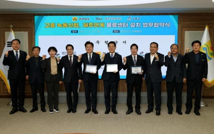 고흥군은 18일 전남도청 서재필실에서 전라남도, 제주특별자치도와 3자 간 녹동신항에 제주 생산품의 내륙 연계 물류거점 조성을 위한 업무협약을 체결했다. 이날 협약식에는 공영민 고흥군수와 김영록 전라남도지사, 오영훈 제주특별자치도지사가 참석해 고흥 녹동신항 내 물류센