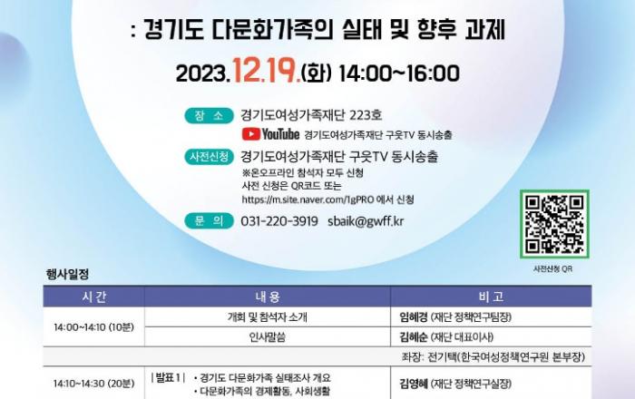 경기도여성가족재단은 19일 오후 2시 재단 회의실에서 ‘경기도 다문화가족 실태조사’ 관련 정책포럼을 개최한다. ‘경기도 다문화가족 실태조사’는 경기도여성가족재단 연구진이 2023년 실시한 경기도 내 다문화 가구조사, 결혼이민