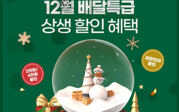 경기도 공공배달앱 배달특급이 성탄을 맞아 18일부터 22일 금요일까지 배달특급 회원을 대상으로 ‘성탄전야 평일 할인’ 이벤트를 진행한다. 이벤트 대상 지역은 가평군과 파주시, 화성시, 오산시, 연천군, 용인시, 과천시, 안양시, 동두천시, 부천