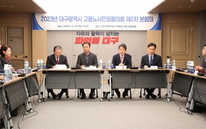 대구광역시는 12월 14일(목) 오후 2시 산격청사 대회의실에서 정장수 대구시 경제부시장, 김위상 한국노총대구지역본부 의장, 김인남 대구경영자총협회 회장 등 고용·노사민정협의회 위원이 참석한 가운데 '2023년 고용·노사민정협의회' 2차 본회의를 개최했다. 대구광역