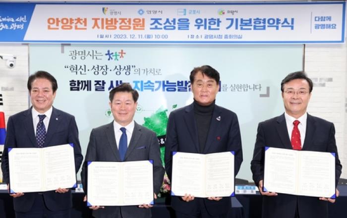 안양천 지방정원 조성에 가속도가 붙을 전망이다. 광명시(시장 박승원)는 11일 오전 10시 시청 중회의실에서 '안양천 지방정원 조성을 위한 기본협약'을 체결했다. 이날 협약식에는 박승원 광명시장, 최대호 안양시장, 하은호 군포시장, 김성제 의왕시장 등 경기권 4