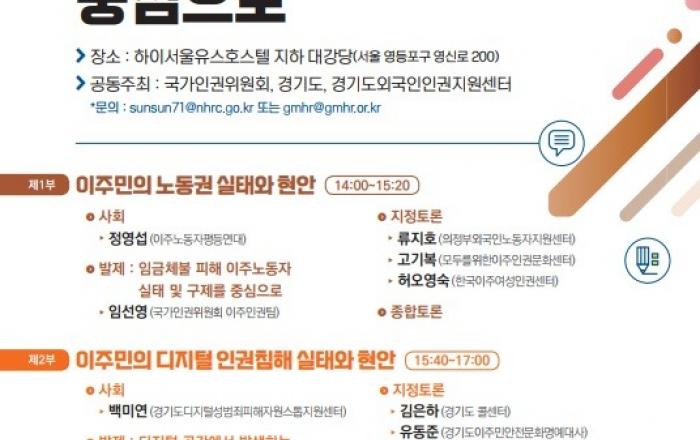 경기도와 경기도외국인인권지원센터(소장 오경석)는 12월 18일 세계이주민의 날을 기념해 오는 14일 오후 2시 하이서울유스호스텔 대강당에서 국가인권위원회와 공동으로 ‘2023 이주민 인권 실태와 정책 토론회: 노동권과 디지털 인권을 중심으로’를 개최한다