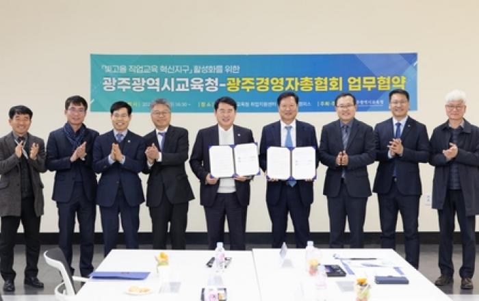 광주시교육청이 지난 5일 '빛고을 직업교육 혁신지구' 사업 활성화를 위해 광주경영자총협회와 업무협약을 체결했다. 6일 시교육청에 따르면 '빛고을 직업교육 혁신지구' 사업은 우리 지역 새내기 기술 인재를 지역 기관이 힘을 모아 교육하고 지역 내에 취업시켜 정주토록