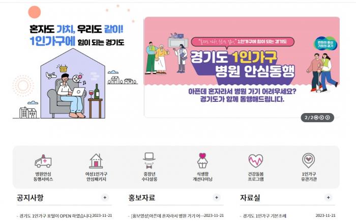 경기도에서 실시하는 1인 가구 정책, 시군별 참여 프로그램 등을 한눈에 볼 수 있는 누리집 ‘경기도 1인가구 포털(https://www.gg.go.kr/1ingg)’이 7일 문을 열었다. 경기도청 누리집에 접속해 분야별 정보에서 가족·다문화