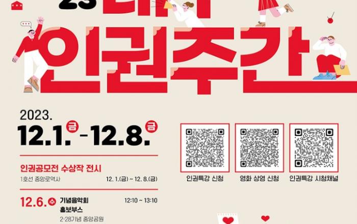 대구광역시는 세계인권선언(1948년 12월 10일) 75주년을 맞아 12월 1일부터 8일까지 국가인권위원회 대구인권사무소와 함께 2.28기념 중앙공원 등 동성로 일대에서 ‘2023 대구인권주간’ 행사를 개최한다. 첫 행사로 12월 6일(수) 기념음악회가 2.2
