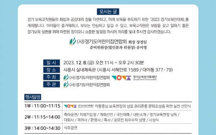 경기도여성가족재단이 오는 8일 오전 10시 시흥시체육관에서 ‘아동중심 보육현장의 상호 권리존중 문화조성을 위한 실천 선언식’을 연다. 이날 행사는 재단과 (사)경기도어린이집연합회가 공동주최하는 ‘2023 경기 보육인 대회’