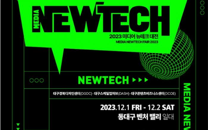 대구광역시와 과기부가 공동 주최하는「2023 미디어 뉴테크 대전」이 12월 1일(금)부터 12월 2일(토)까지 양일간 대구경북디자인센터 등 동대구벤처밸리 일대에서 개최된다. 〈2023 미디어 뉴테크 대전 개요〉 ○기간/장소 : ’23. 12. 1.(금)∼12