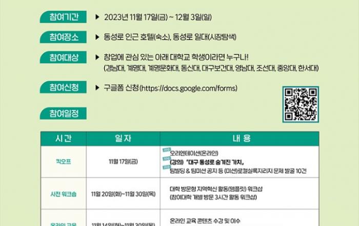 대구광역시는 12월 1일부터 2박 3일간 동성로 일원에서 지자체-대학-산업계가 협력하는 ‘온기스쿨 in 대구 동성로’를 개최한다. ‘온기스쿨’은 쇠퇴한 도심에 활력을 불어넣기 위해 대학생들이 도심에 모여, 지역사회 문제 해결과 새로운 아이디어를 자유롭게 도출하