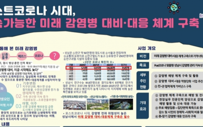성남시가 질병관리청 주관 ‘2023년 감염병관리 콘퍼런스’ 에서 지역사회 감염병 관리 우수사례로 선정돼 은상을 수상한다. 감염병관리 콘퍼런스는 30일부터 12월 1일까지 평창 알펜시아리조트에서 질병관리청 주관으로 열린다. 이번 행사에는 17개 시·도 감