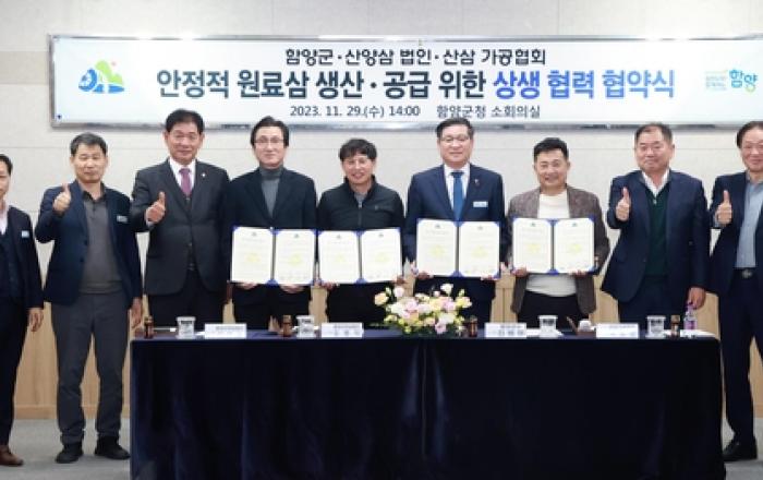 함양군은 11월 29일 오후 2시 군청 소회의실에서 지역 내 산양삼 생산 법인 및 가공협회와 '함양 산양삼 산업화와 안정적 원료삼 생산·공급을 위한 상생 협력 협약'을 체결했다. 원료삼의 안정적인 생산과 공급을 통한 산양삼 가공산업 활성화를 위해 마련된 이날 협약식