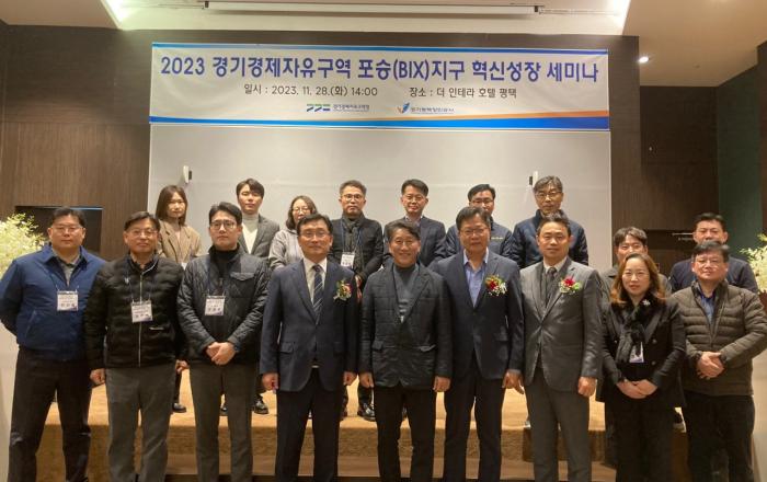 경기경제자유구역청은 28일 평택시 더인테라호텔에서 포승(BIX)지구 입주기업 활동 지원을 위한 ‘2023 경기경제자유구역 포승(BIX)지구 혁신성장세미나’를 개최했다. 세미나는 경제자유구역 포승(BIX)지구내 입주기업간 협력