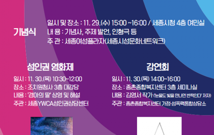 세종특별자치시가 29일부터 30일까지 ‘함께 만드는, 여성폭력 없는 안전한 세종’을 주제로 여성폭력 추방 주간 행사를 개최한다. 여성폭력 추방 주간은 매년 11월 25일부터 12월 1일까지로, 여성폭력기본법에 근거해 국민적 관심을 높이기 위해 지난 20