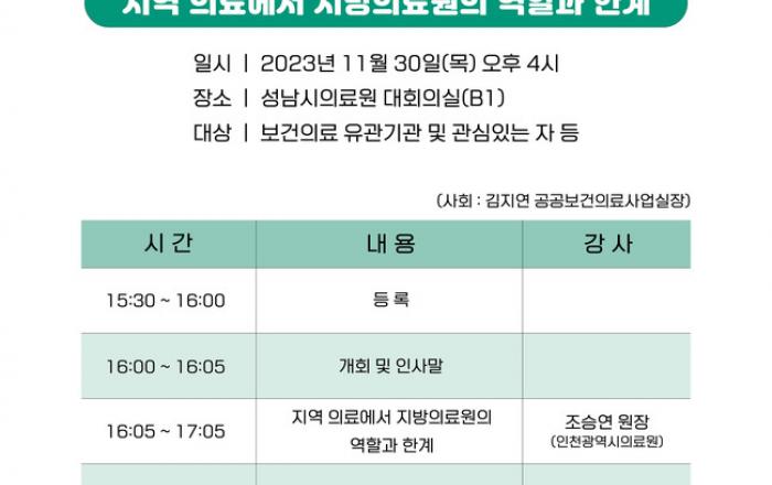 성남시은 오는 30일 성남시의료원 지하1층 대회의실에서 ‘2023년 제2회 공공의료정책 세미나’를 개최한다. 이번 세미나는 현재 지역 의료권이 처한 여건을 돌아보고 지방의료원의 역할을 모색하기 위해 마련된 것으로, 조승연 인천광역시의료원 원장이 ‘지역의료에서