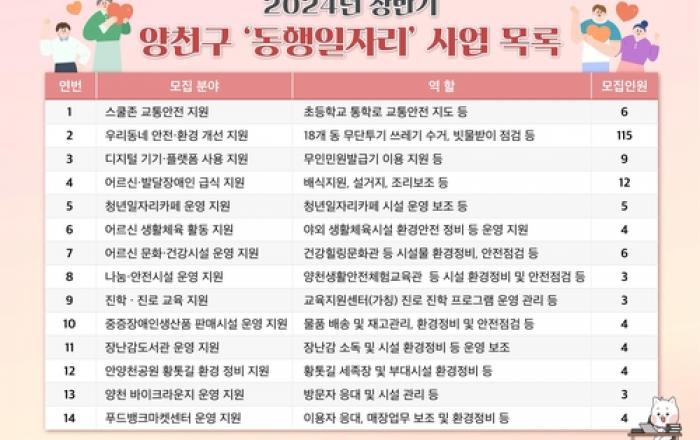 양천구는 취업 취약계층에게 직접 일자리를 제공해 고용 및 생계안정을 도모함으로써 약자가 약자를 돕는 자조·자립 기반의 '2024년 상반기 양천구 동행일자리 사업'을 추진하고, 다음 달 5일까지 참여자 182명을 모집한다고 밝혔다. 사업 분야는 ▲안양천공원 황톳길 환