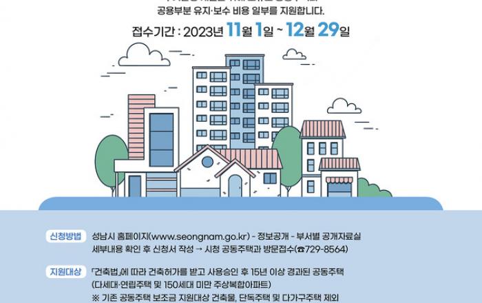 성남시는 오는 12월 29일까지 ‘2024년도 소규모 공동주택 보조금 지원사업’ 신청을 받는다. 낡은 소규모 공동주택의 쾌적한 주거환경 조성을 위해 노후한 공동시설 개선 공사를 지원하려는 사업이다. 지원 대상 주택은 건축법에 따라 허가받아 건축한 다세대주택, 연
